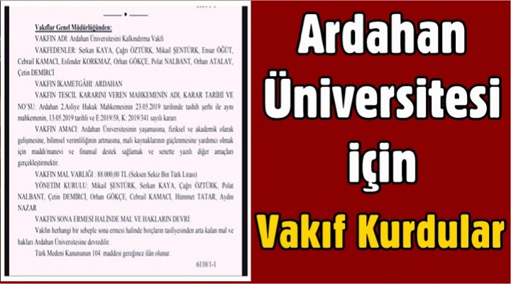 Edinilen bilgiye göre ‘’Ardahan Üniversitesi Kalkındırma Vakfı’’ kurucuları şu şekilde oluştu. Ardahan Ak Parti Milletvekili Orhan Atalay, CHP eski Ardahan Milletvekili Ensar Öğüt, yine eski vekillerden Esfender Korkmaz, KAISİAD Başkanı Orhan Gökçe, Ardahan Ticaret ve Sanayi Odası Başkanı. Çetin DEMİRCİ, Serkan Kaya, Çağrı Öztürk, Polat Nalbant, Mikail Şentürk, Cebrail Kamacı yer aldı.