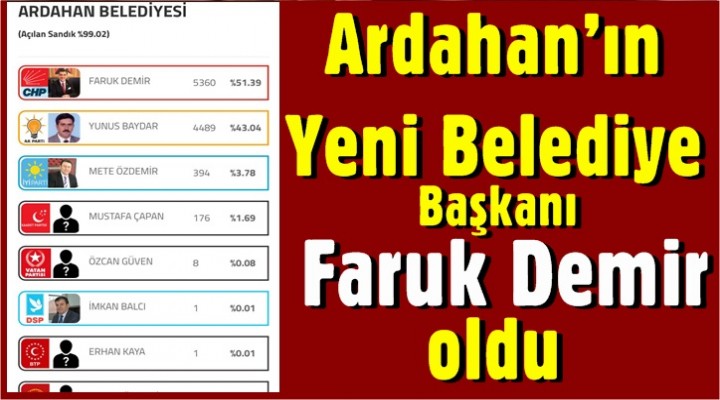 Doğu ve güney Doğuda saat 16.00’dan sonra oy sandıklarının kapanmasının ardında Ardahan’da açılan sandıklar sonucu CHP Ardahan Belediye başkan adayı Faruk Demir oldu. Yapılan oylamada 2 Dönem İktidar Partisi’nde olan ve yerel seçimde AK Parti Adayı Yunus Haydar’a Bin oy Fark atarak seçilen Faruk Demir, 5336 oy alarak Ardahan’ın belediye başkanı seçildi.