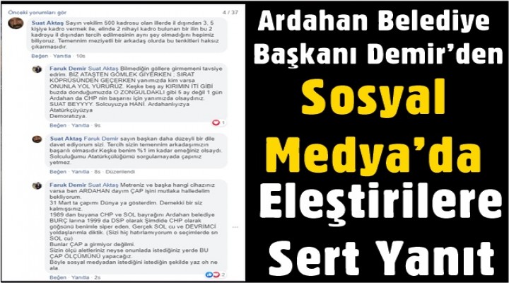 Bu yazılan yazının altına birçok olumlu yazı yazanda oldu, Sayın Öğüt’e tepki gösterenlerde oldu. Sosyal medyadan görüşlerini dile getiren Ardahanlılar ve bazı CHP’liler Başkan Faruk Demir’in sert tepkilerinin hedefi oldu.