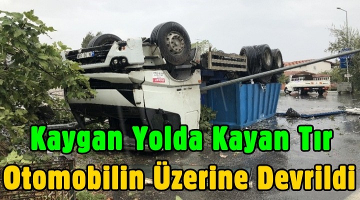 Kaygan yolda kayan tır otomobilin üzerine devrildi