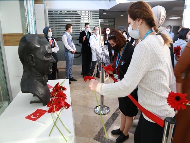 Atatürk büstüne karanfillerin bırakıldığı ve programda Atatürk’ün resimlerden oluşan köşe oldukça ilgi çekerken, anma etkinliğinde kısa bir konuşma yapan, Hastanesi Genel Müdürü Öğretim Üyesi Opr. Dr. Atakan Özkan, ‘10 Kasım Ulu Önder Mustafa Kemal Atatürk"ün aramızdan bedenen ayrılışının 83. Yıl dönümü. Evet bedenen bir ayrılış bu. Zira O, idealleriyle, düşünceleriyle ve bize kazandırdıkları ile 83 yıldır aramızda. Ve nice yıllar aramızda olmaya devam edecek.