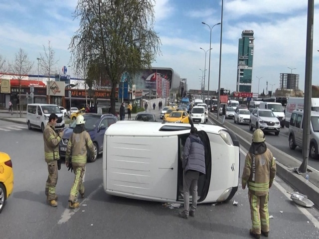 Esenyurt'ta, D-100 karayolu yan yolunda hafif ticari araç, elektrik direğine çarptıktan sonra takla attı.