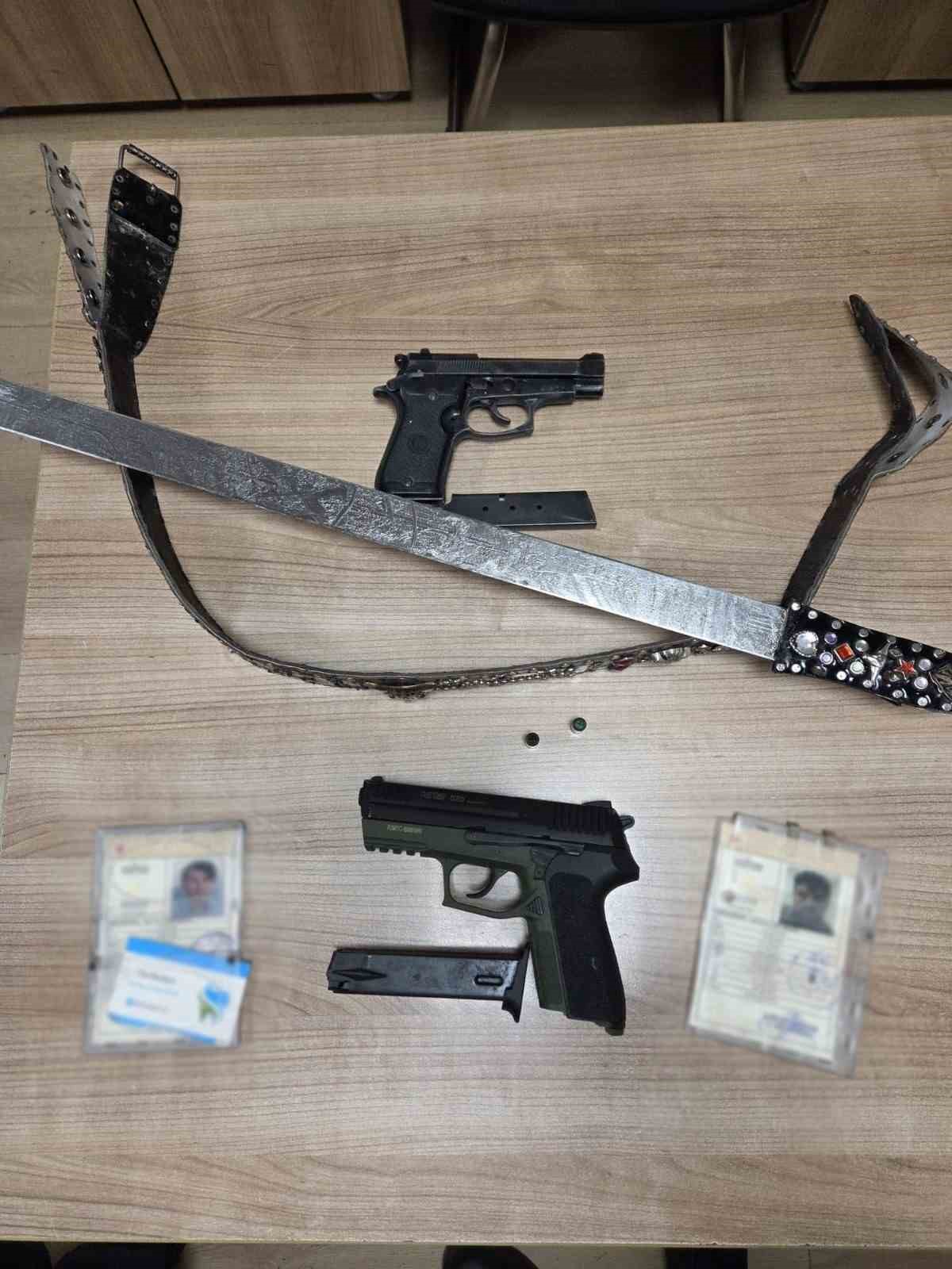 İhbar üzerine olay yerine gelen polis ekipleri çalışma başlattı. Kalabalığı dağıtan ekiplerin kimlik bilgileri tespit edilen A.A. isimli şahısı 1 adet kurusıkı tabanca ve bir adet kemer görünümlü kılıç ile birlikte, H.E. isimli şahıs ise, 1 adet ruhsatsız tabanca ile birlikte yakaladığı öğrenildi. Emniyette işlemleri biten 2 şüpheli şahıs bugün adliyeye sevk edildi.