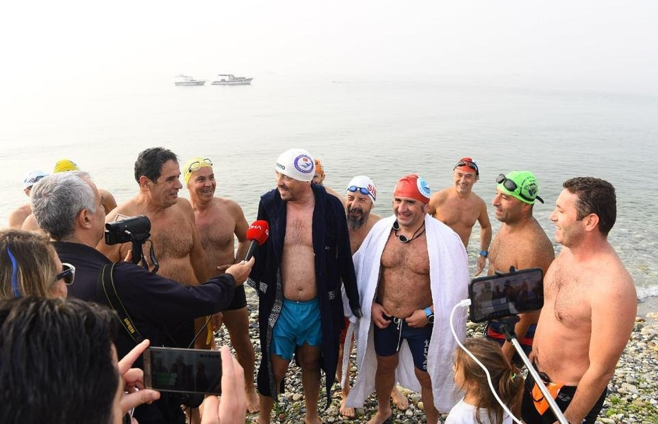 Belediye Başkanı Av. Turan Hançerli ve vatandaşlar, sahilde yürüyüş yaptıktan sonra, denizde 1 km yüzdü.