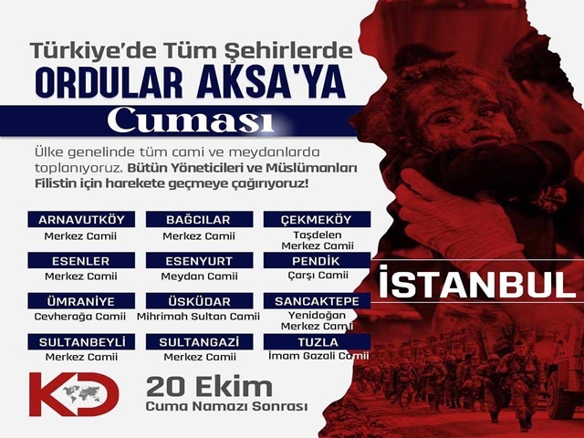 Köklü Değişim Temsilciliği'nden yapılan açıklamada Filistin’deki kardeşlerimizin yanında olduğumuzu göstermek ve gasıp yahudi varlığını protesto etmek için 20 Ekim Cuma namazı çıkışı 12 ilçede basın açıklaması ve dua programlarımıza tüm halkımız davetlidir denildi
