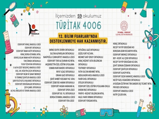 Millî Teknoloji hamlesinin temel unsurlarından biri olan beşeri sermayenin geliştirilmesi hedefi doğrultusunda, öğrencilerin bilimsel proje hazırlama konusunda teşvik edilmesini amaçlayan, 4006 TÜBİTAK Bilim Fuarları Destekleme Programının 12'nci dönem başvuruları kapsamında Esenyurt'tan 59 okulun projesi desteklenmeye hak kazandı.